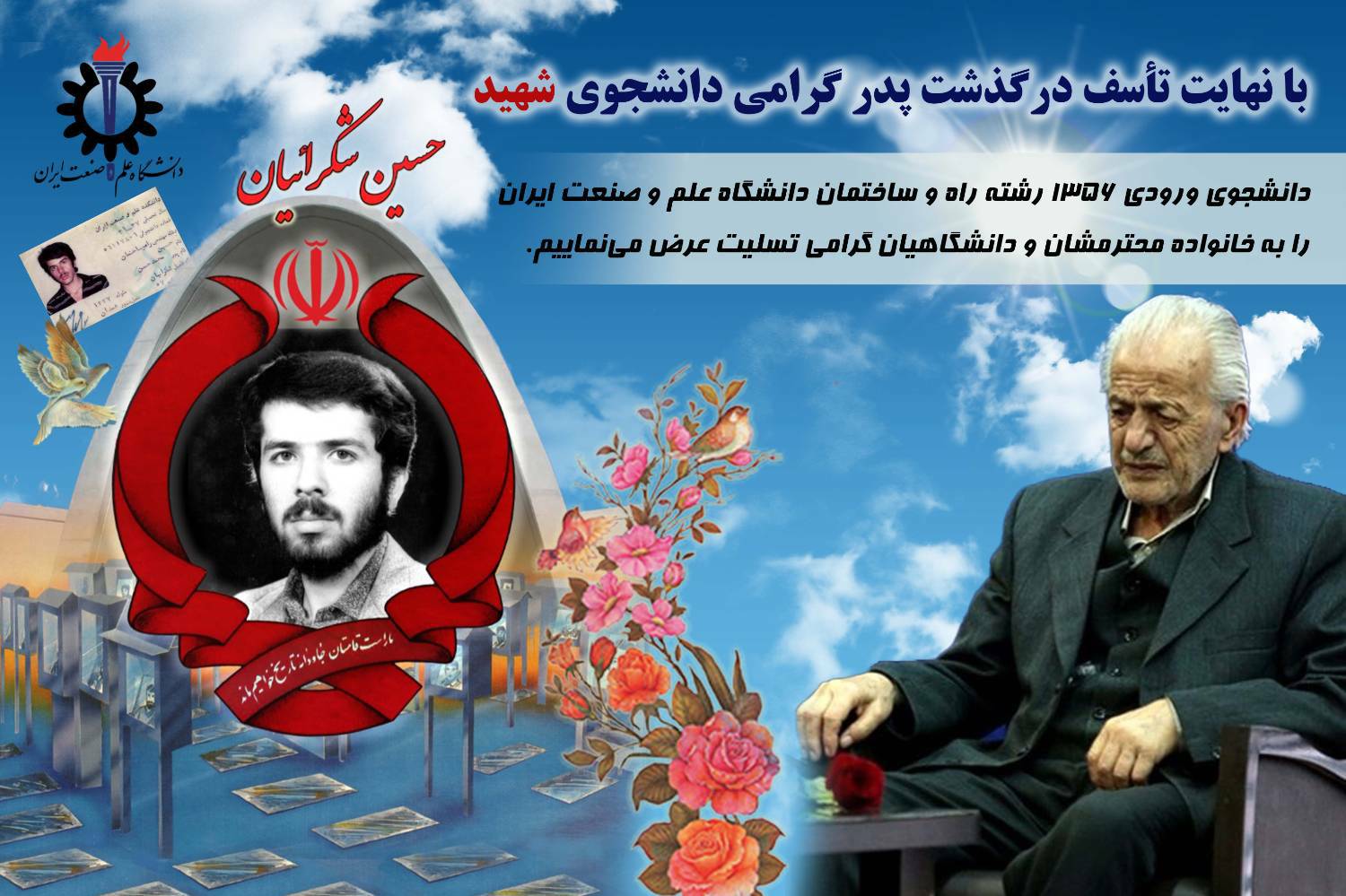 با نهایت تأسف و تأثر درگذشت پدر گرامی دانشجوی شهید حسین شکرائیان ، دانشجوی ورودی ۱۳۵۶ رشته راه و ساختمان(مهندسی عمران) دانشگاه علم و صنعت ایران را به خانواده محترم ایشان و دانشگاهیان گرامی تسلیت عرض می نماییم.