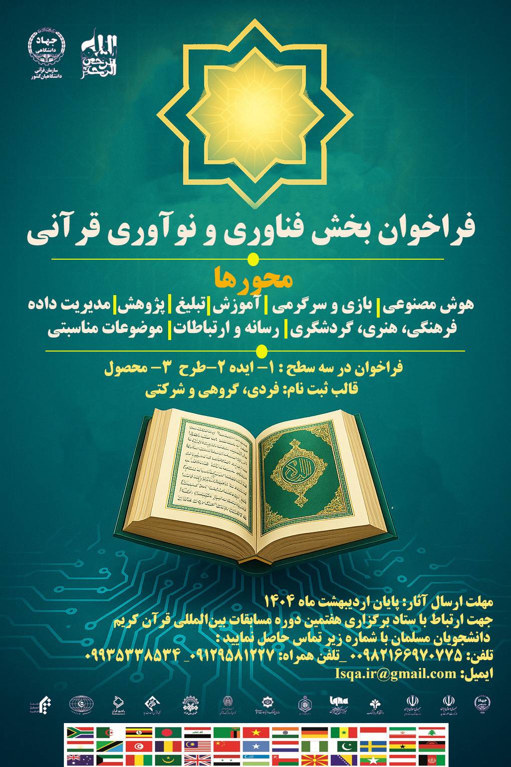 سازمان فعالیت های قرآنی دانشگاهیان کشور در حوزه فناوری و نوآوریهای قرآنی اقدام به برگزاری "هفتمین دوره مسابقات بین-المللی قرآن کریم دانشجویان مسلمان " میکند. (ویژه اساتید و دانشجویان)